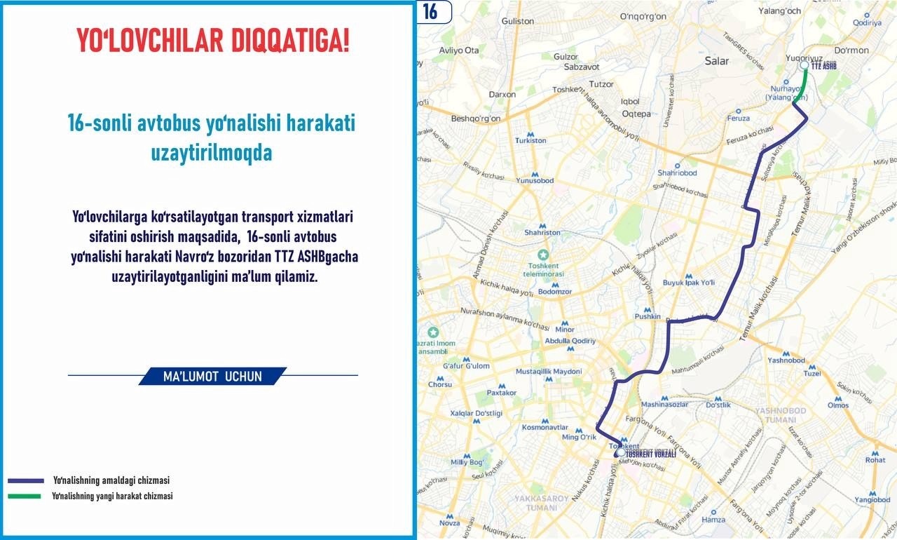16-sonli “Navro‘z bozori – Toshkent vokzali” avtobus yo‘nalishining harakati Navro‘z bozoridan TTZ ASHBgacha uzaytiriladi;