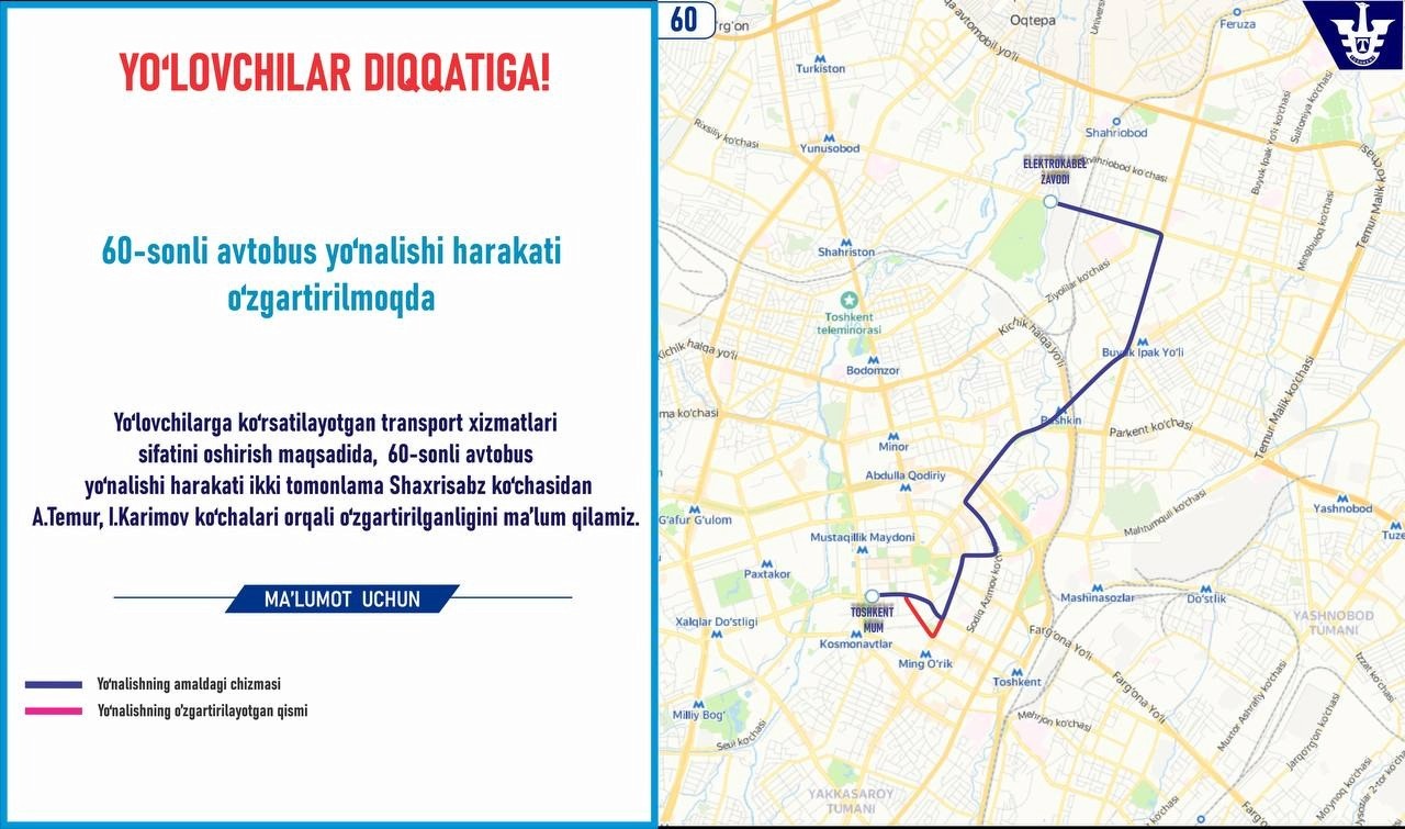 60-sonli “Elektrokabel zavodi – Toshkent MUM” avtobus yo‘nalishining harakati ikki tomonlama Shaxrisabz ko‘chasidan A.Temur, I.Karimov ko‘chalari orqali o‘zgartiriladi;