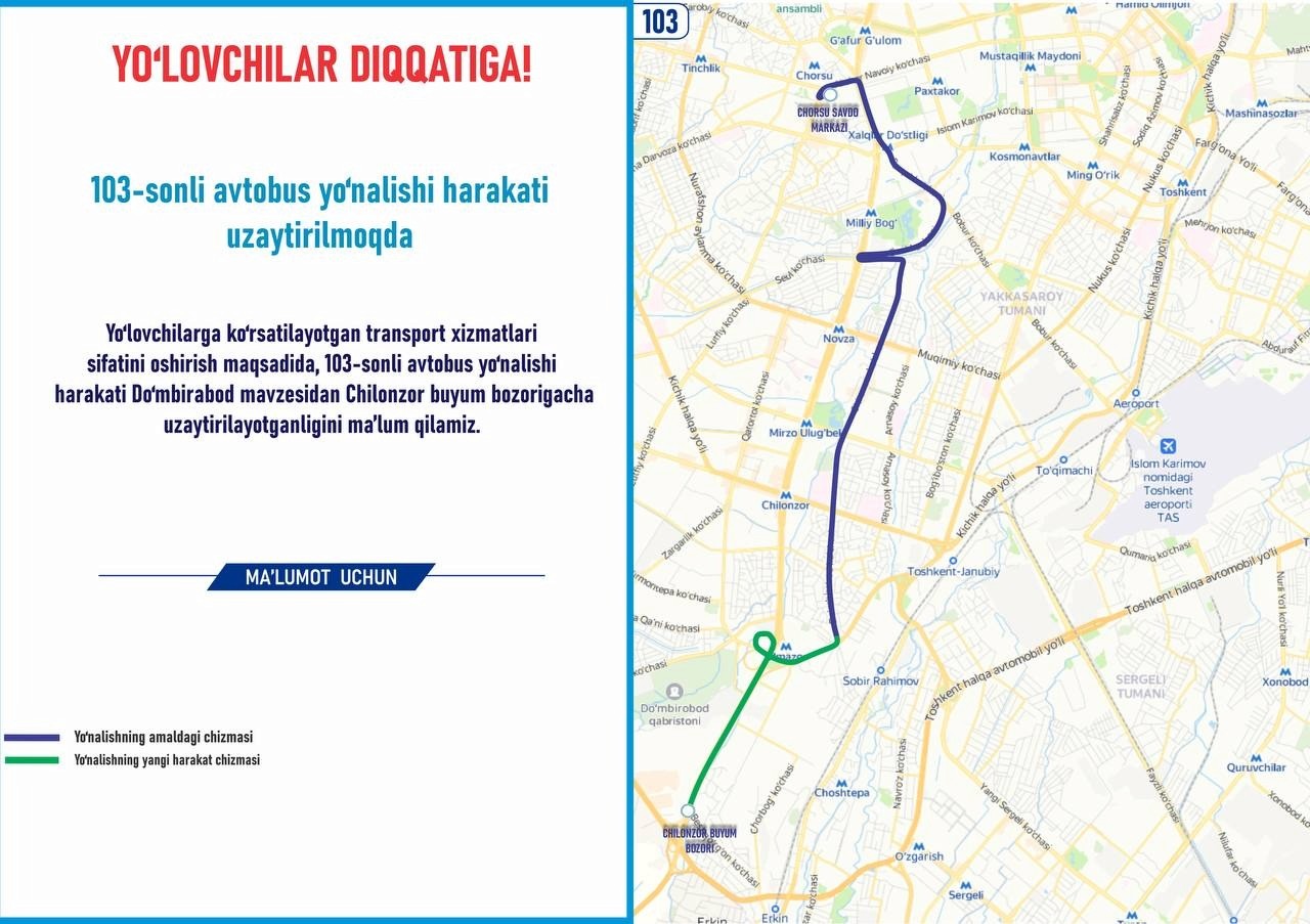 103-sonli “Do‘mbirabod mavzesi – Chorsu savdo markazi” avtobus yo‘nalishining harakati Do‘mbirabod mavzesidan Chilonzor buyum bozori ASHBgacha uzaytiriladi;