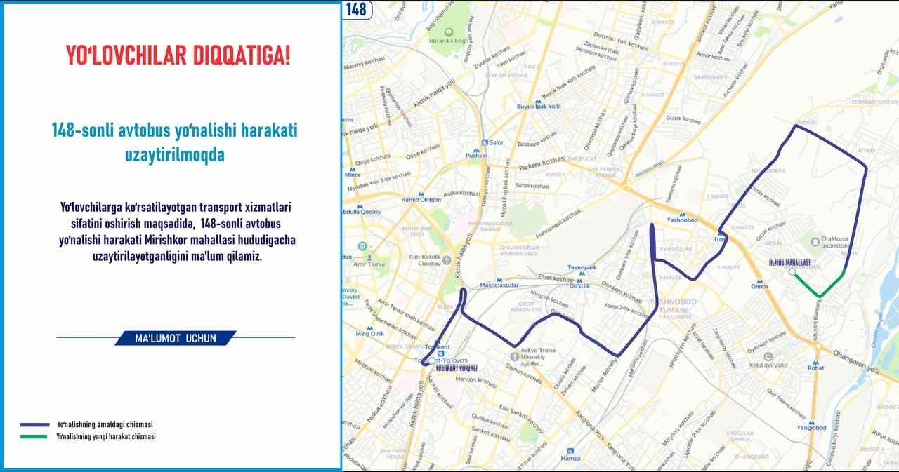 148-sonli “Mirishkor mahallasi – Toshkent vokzali” avtobus yo‘nalishining harakati Mirishkor mahallasidan Olmos mahallasi hududigacha uzaytiriladi.