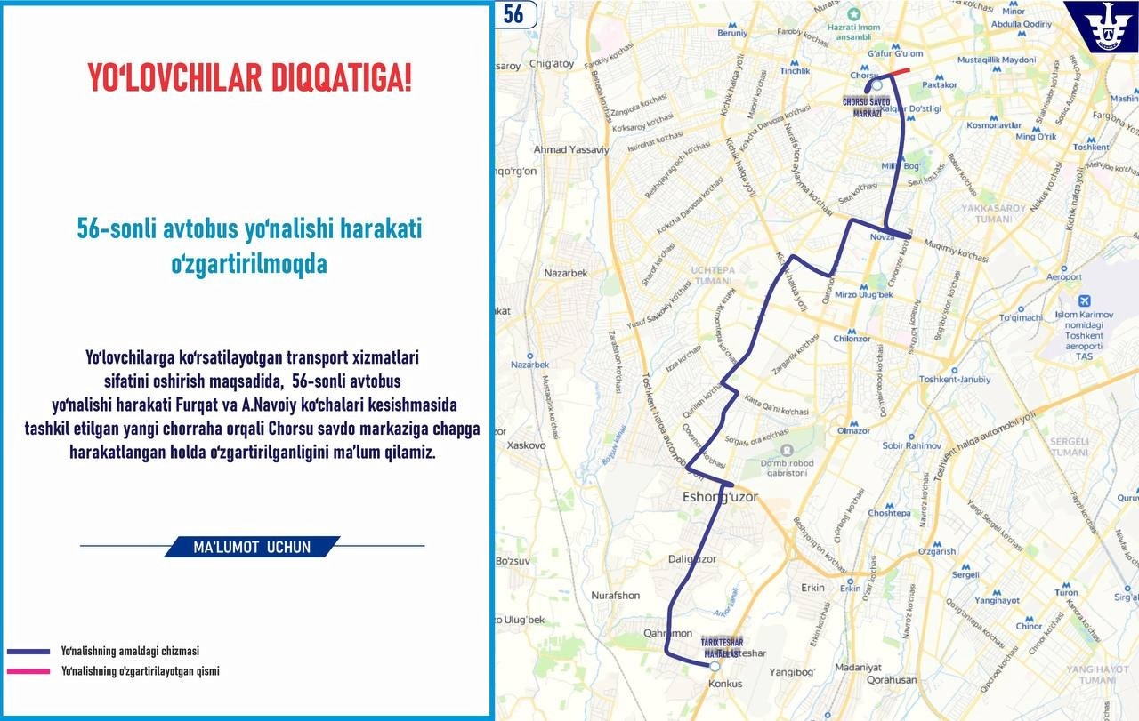 56-sonli “Tarixteshar mahallasi – Chorsu savdo markazi” avtobus yo‘nalishining harakati bir tomonlama Furqat va A.Navoiy ko‘chalari kesishmasida tashkil etilgan yangi chorraha orqali Chorsu savdo markaziga chapga harakatlangan holda o‘zgartiriladi;