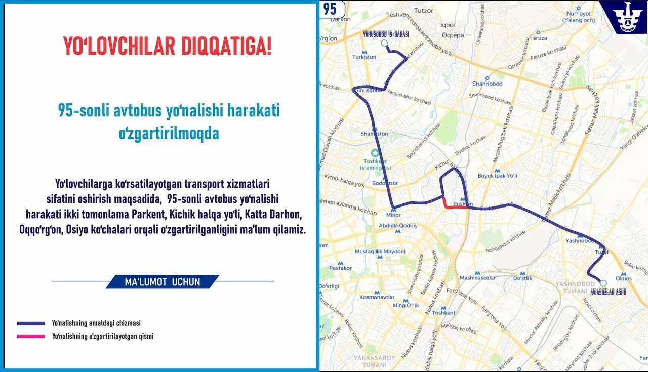 95-sonli “Yunusobod 15-dahasi – Aviasozlar ASHB” avtobus yo‘nalishining harakati ikki tomonlama Parkent, Kichik halqa yo‘li, Katta Darxon, Oqqo‘rg‘on, Osiyo ko‘chalari orqali o‘zgartiriladi;