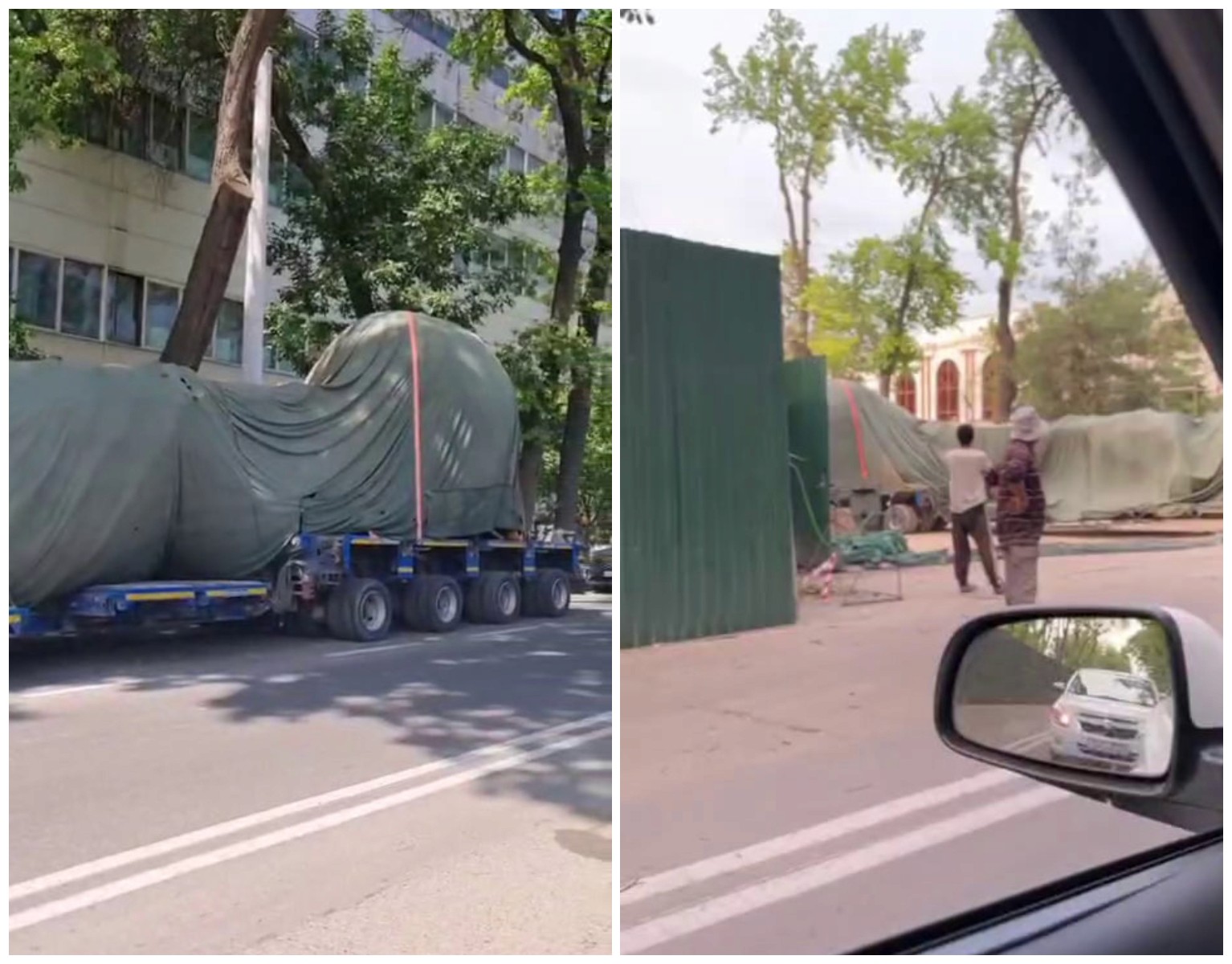 Tarmoqlarda tarqalgan videolarda buzilayotgan bino hududidan yirik daraxtlar ustiga mato tashlangan holda olib chiqib ketilayotgani ko‘rinadi.