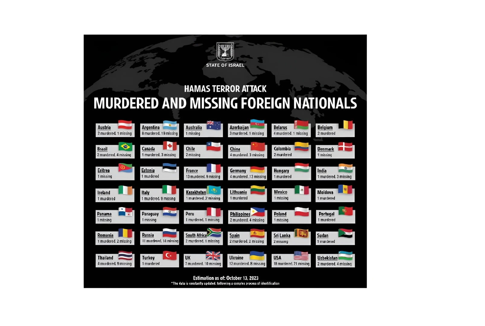 Ro‘yxatga ko‘ra 13-oktyabr holati bilan eng ko‘p qurbonlarga ega davlatlar sifatida AQSH, Fransiya va Ukraina ko‘rsatilgan: